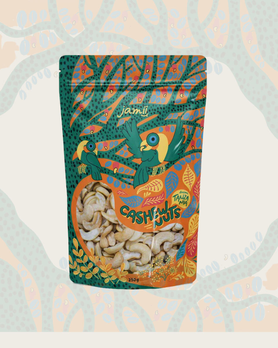 Jamii cashews are grown in the southern regions of Tanzania, where fertile soil and coastal sun help produce some of the largest cashews in the world. Hand-picked at peak ripeness, each nut is carefully processed without roasting to preserve its naturally rich, buttery flavour and smooth, creamy texture.